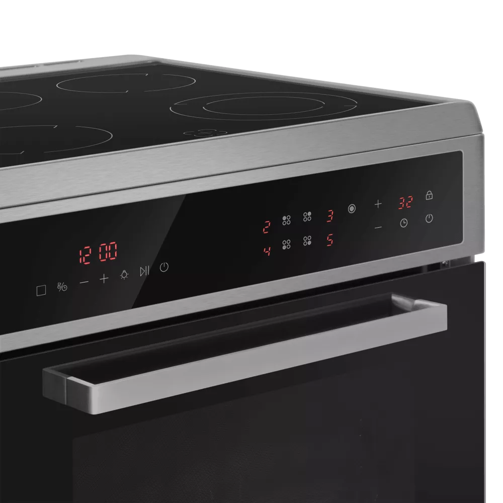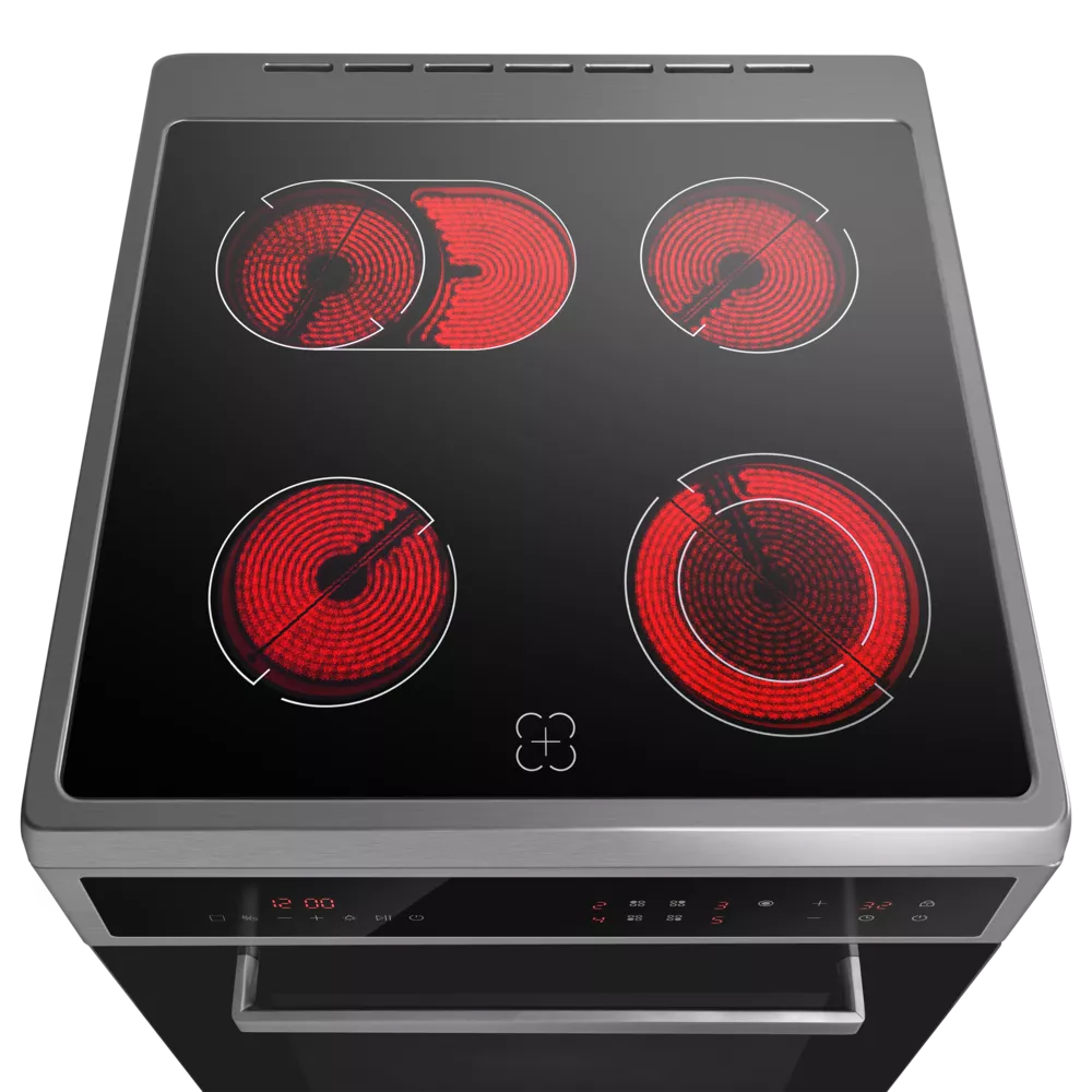 Стеклокерамическая варочная поверхность сочетает привлекательный внешний вид и практичность: гладкая плоскость легко очищается, а двухконтурная зона расширения помогает подстроиться под посуду. Сенсорное управление с дисплеем и индикацией делает взаимодействие интуитивным, а блокировка панели повышает безопасность при работе.