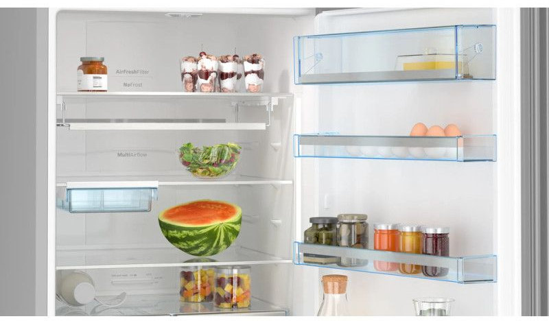 Для стабильного климата и равномерного охлаждения используется система No Frost с MultiAirflow, а также предусмотрены режимы ускоренного понижения температуры — суперохлаждение в холодильной камере и SuperFreezing в морозильной. Это удобно при больших закупках: продукты быстро выходят на нужный температурный режим.