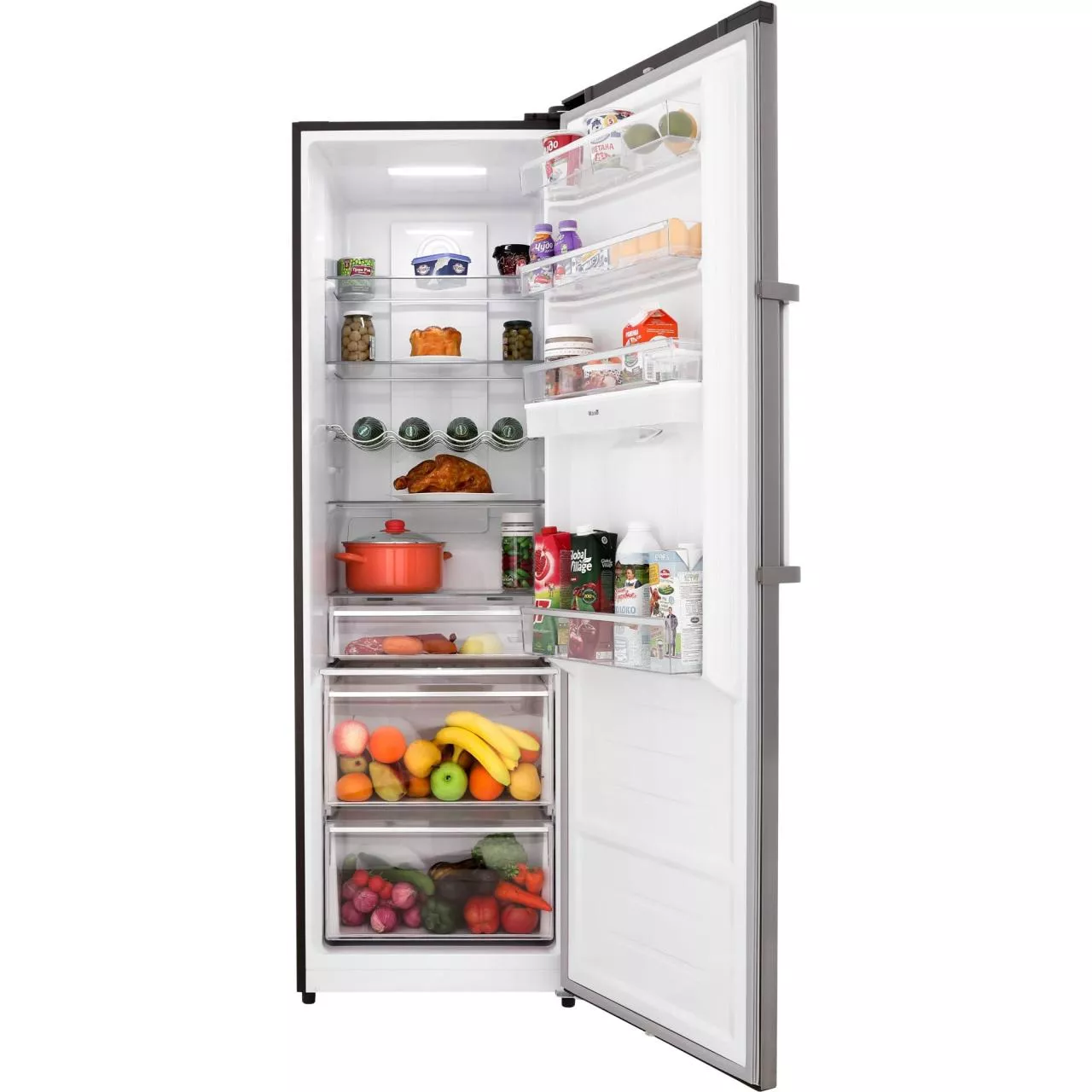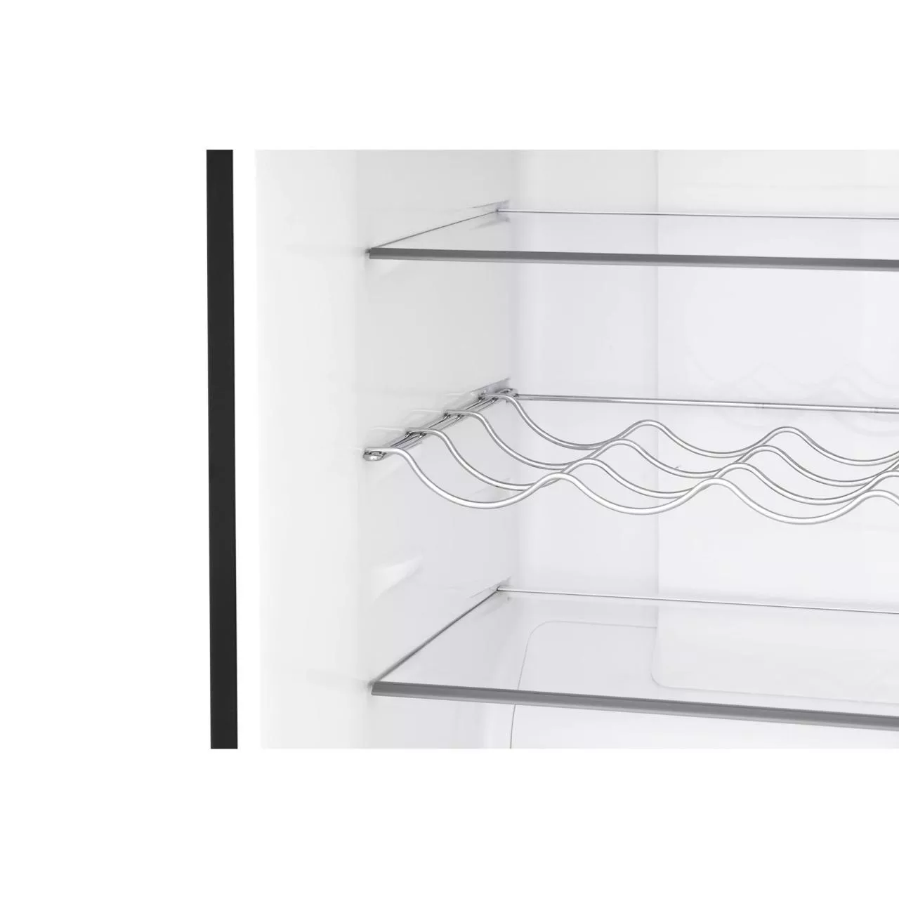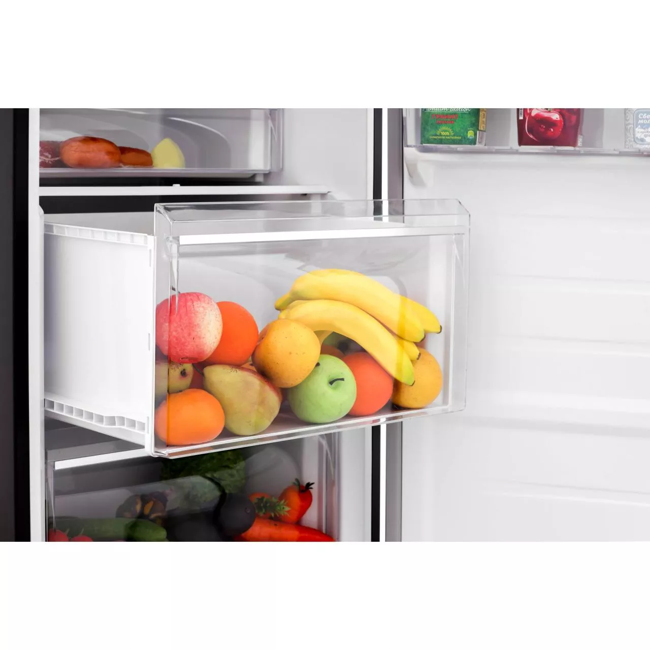 Холодильник воплощает в себе сочетание элегантного дизайна и функциональности. Стеклянные полки и глубокие прозрачные ящики создают удобное внутреннее пространство для хранения продуктов. Двери холодильника имеют возможность перенавешивания на другую сторону. Корпус модели — серебристого цвета. Высота холодильника — 185 сантиметров.