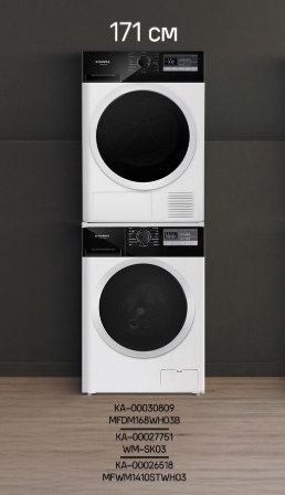 Комплект Maunfeld сочетает в себе стиральную машину MFWM1410STWH03, сушильную машину MFDM168WH03B и соединительный элемент WM-SK03. Такое решение позволяет создать полноценный центр ухода за бельём, экономя пространство и время.