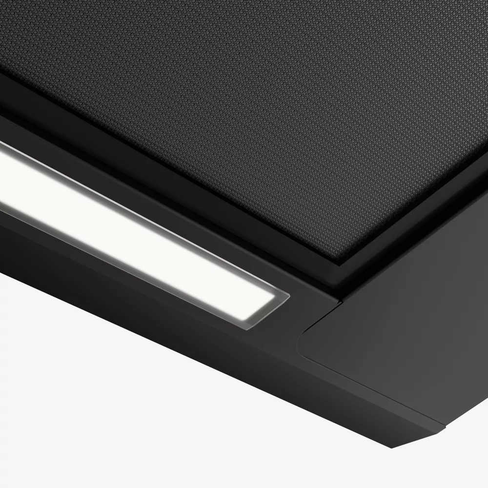 Наклонная конструкция дополняется LED-лентой с регулировкой яркости и теплоты света, чтобы равномерно подсветить варочную поверхность. В комплекте уже предусмотрены угольный фильтр и увеличенный жироулавливающий фильтр, а минимальная высота монтажа 45 см упрощает интеграцию в кухонный проект.