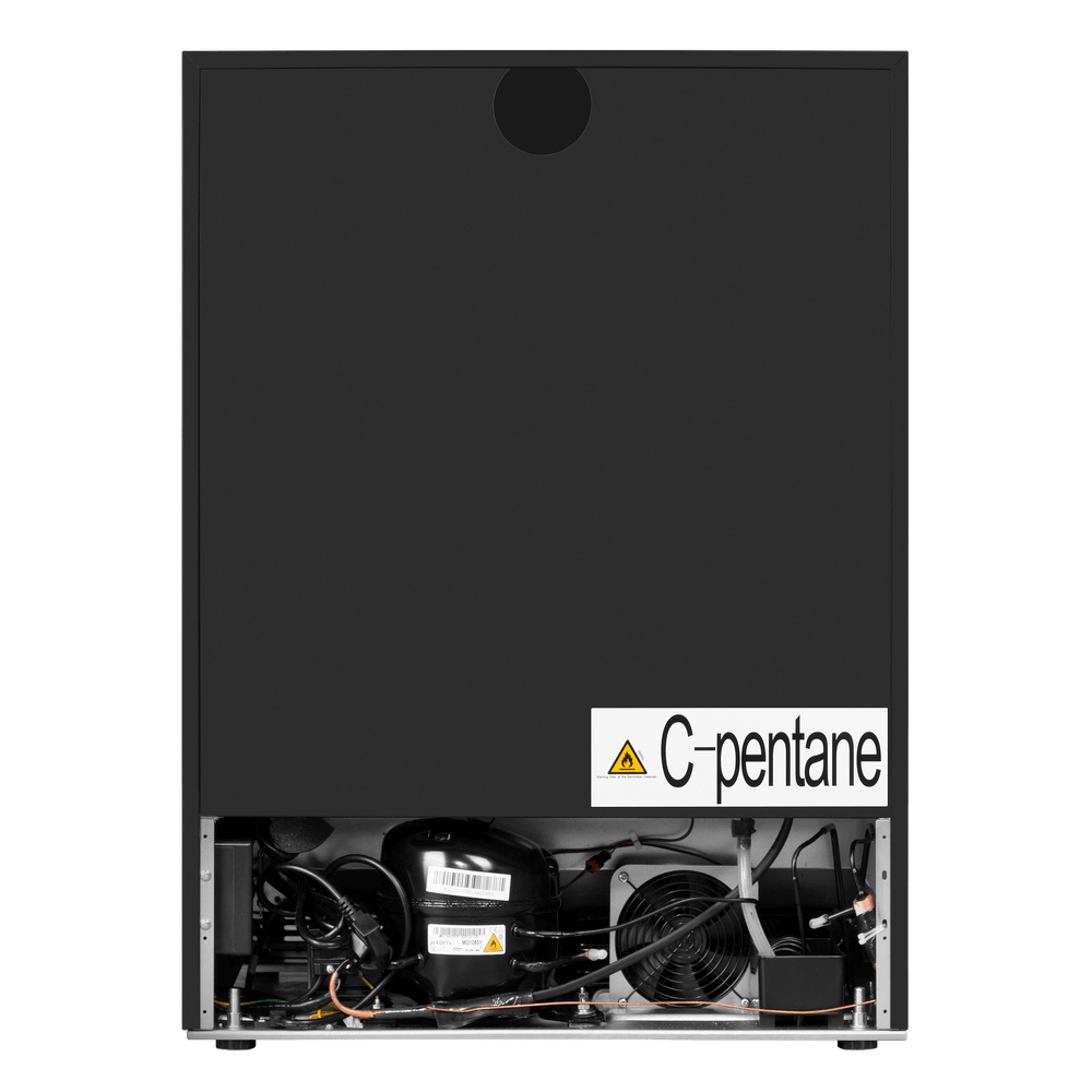 Элегантный корпус из черного металла и стеклянная дверца с защитой от УФ-лучей гармонично сочетают стиль и практичность. Внутреннее пространство организовано с помощью 5 деревянных полок из массива бука, что обеспечивает правильное хранение бутылок и минимизирует вибрации.